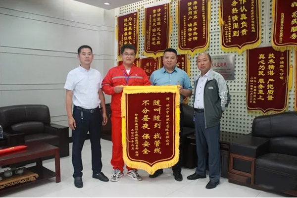6月28日,濱州中油燃氣收到濱州城建集團三公司總經理王建民送來的“隨叫隨到找管線、不分晝夜保安全”的錦旗,感謝濱州中油燃氣為城市建設做出的貢獻。