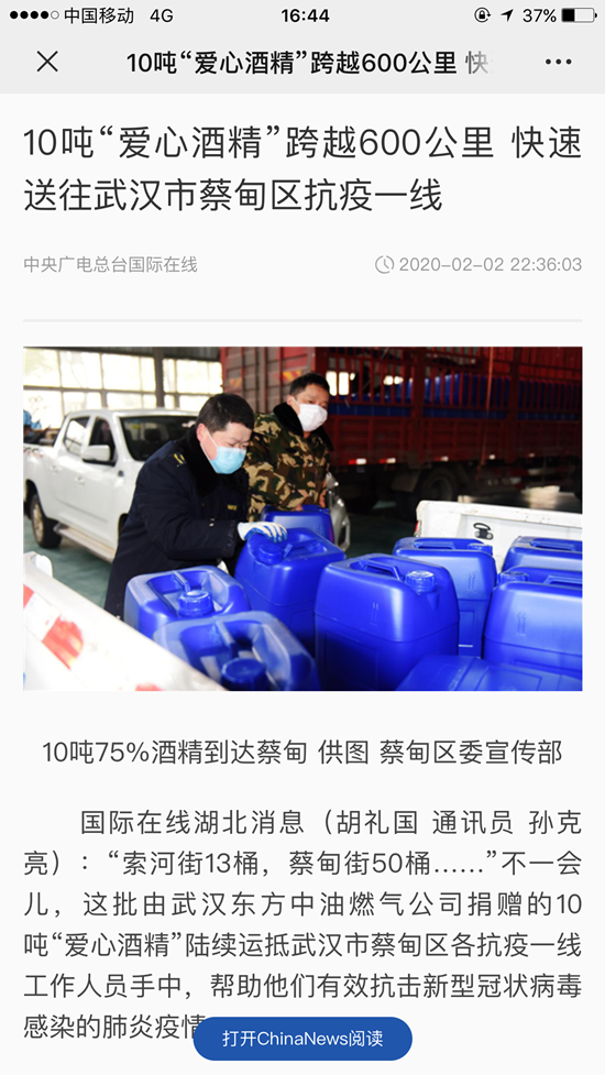 《中央廣電總臺》:10噸愛心酒精跨越600公里 快速送往武漢抗疫前線