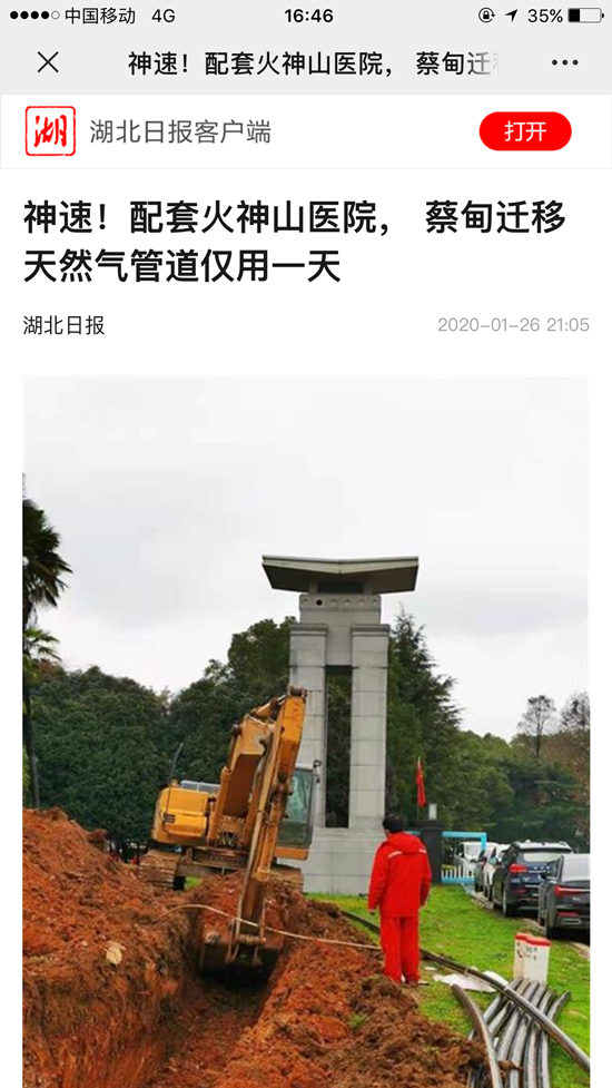 《湖北日報》:神速!配套火神山醫院,蔡甸遷移天然氣管道僅用一天