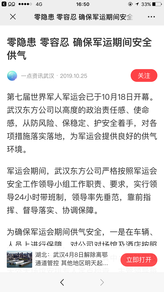 《一點資訊武漢》:零隱患 零容忍 確保軍運期間安全供氣