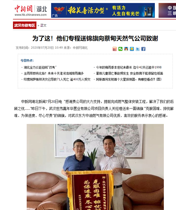 《中新網(wǎng)》:為這事,他們專(zhuān)程送錦旗向蔡甸天然氣公司致謝