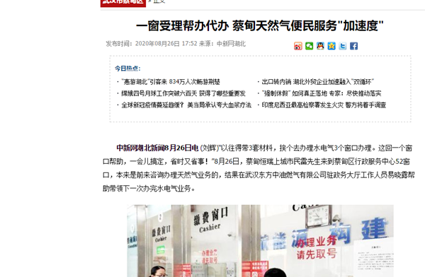 《中新網湖北》一窗受理幫辦代辦 蔡甸天然氣便民服務“加速度”