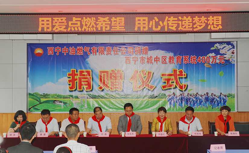 2013年7月5日,西寧中油燃氣有限責任公司對西寧市城中區教育事業捐贈400萬元,用于更新、更換該區部分學校的桌凳。時任西寧中油燃氣有限責任公司董事長王樂天、總經理尚龍慶和城中區四大班子的領導,出席了當天的捐贈儀式。