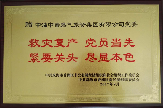 為表彰集團(tuán)公司黨委在“天鴿”風(fēng)災(zāi)中救災(zāi)復(fù)產(chǎn)的突出表現(xiàn),9月14日,珠海市香洲區(qū)兩新組織黨委副書記梁何一行來到集團(tuán)總部,向集團(tuán)黨委頒發(fā)了“救災(zāi)復(fù)產(chǎn),黨員當(dāng)先,緊要關(guān)頭,盡顯本色”的榮譽(yù)牌匾,并授予集團(tuán)黨委“黨員自愿者服務(wù)大隊(duì)”旗幟。