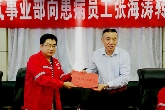 “謝謝青海燃?xì)馐聵I(yè)部領(lǐng)導(dǎo)和同事們的關(guān)心,我代表張海濤謝謝大家”張海濤哥哥張仲明接過(guò)青海燃?xì)馐聵I(yè)部各公司及員工充滿關(guān)心和溫暖的愛(ài)心捐款,向援助張海濤的青海燃?xì)馐聵I(yè)部的全體員工不停表示感謝。6月22日上午9時(shí),青海燃?xì)馐聵I(yè)部舉行了“青海燃?xì)馐聵I(yè)部向患病員工張海濤轉(zhuǎn)交捐款儀式”。中油中泰西部區(qū)域工會(huì)聯(lián)合會(huì)主席、西寧中油燃?xì)夤靖笨偨?jīng)理丁濤、青海東部公司總經(jīng)理倪友偉代表青海燃?xì)馐聵I(yè)部出席了此次捐款轉(zhuǎn)交儀式。