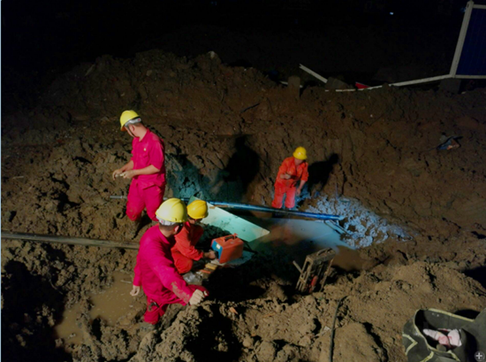 公司客服中心接到燃氣洩漏報警電話,公司迅速啟動應急預案,安全部立即組織人員對險情現場進行勘察,下午13點46分關閉上游相應氣閥。經查看,筦道受損部位在河水中,現場當時並不滿足維搶條件,但為確保管網安全,避免安全事故發生,同時保障當地3000餘居民的正常用氣,經公司領導與社區領導研究決定,社區組織人員將河水進行分流,對挖破區域用泥土、石塊進行圍擋。19:37分完成填土圍擋後,公司維搶修隊和前來協助維搶修的施工單位立即開展維搶,在泥水中奮戰近3個小時,終於排除險情,完成搶修工作。