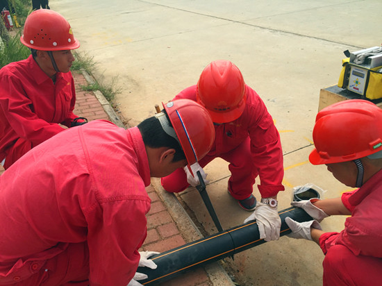 本次演練內容是類比筦道洩漏事故應急搶險,錦繡東大道東側筦道被協力廠商挖壞,致使燃氣洩漏引起著火造成人員受傷,巡線人員發現險情後,進行現場處理並上報。應急演練總指揮總經理黃科立即啟動《天然氣泄漏搶險專項應急預案》,全體員工根據應急預案的要求分組,通過進行搶修、警戒、人員疏散、環境監測醫療救護等工作,完成了事故報警及應急調度演練、著火點緊急撲救演練、事故現場安全警戒安全疏散演練、事故現場監測及搶險程式演練。