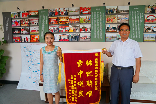 9月1號下午,如皋港區管委會副主任王洪海一行來到南通公司,將印有“雪裏送碳、排憂解難”的錦旗遞到總經理譚彥手中,感謝南通公司為港區高級中學“搶時間、保通氣”,解決了學校9月1日開學2000多名師生伙食供應的難題。