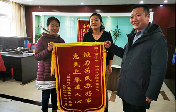2月21日,西寧中油燃?xì)庥邢挢?zé)任公司收到山川北村社區(qū)全體業(yè)主送來的一面印有“傾力為民辦好事、惠民之舉暖人心”的錦旗,誠摯感謝公司在安裝管道天然氣過程中給予的大力支持和幫助。